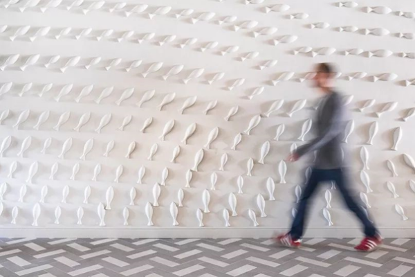 這道墻上的魚形由石膏通過具有細(xì)微變化的不同模具制成,整堵墻有整整163條。
